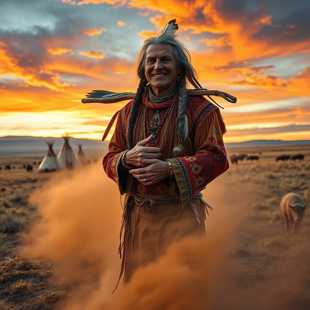This image shows a Heyoka medicine man standing in a dust devil on the prairie. He is wearing traditional clothing and holding a staff, with a herd of bison grazing in the background during a vibrant sunset, rendered in photorealistic style.