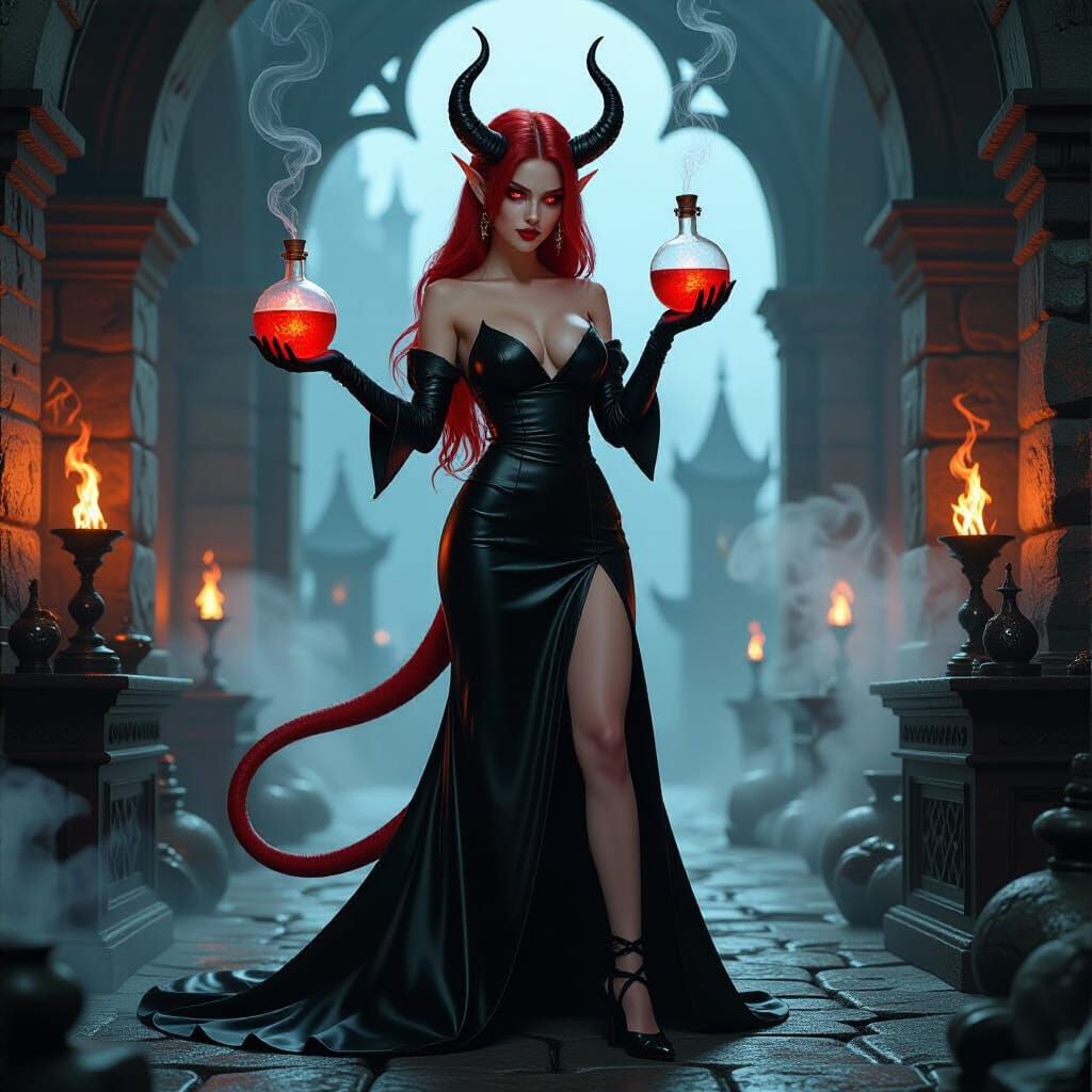 This image shows a Tiefling alchemist in a shadowy, gothic setting. She mixes explosive concoctions with vibrant red hair, subtle red eyes, and curved horns, styled with dark fantasy and mystical realism.
