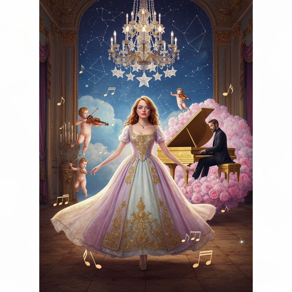 This image depicts Emma Stone as Mia in a Rococo fantasy, dancing in a grand ballroom with celestial elements. Features a flowing pastel gown, musical notes, cherubs, and a piano-playing silhouette. Inspired by Baroque and Surrealist art.