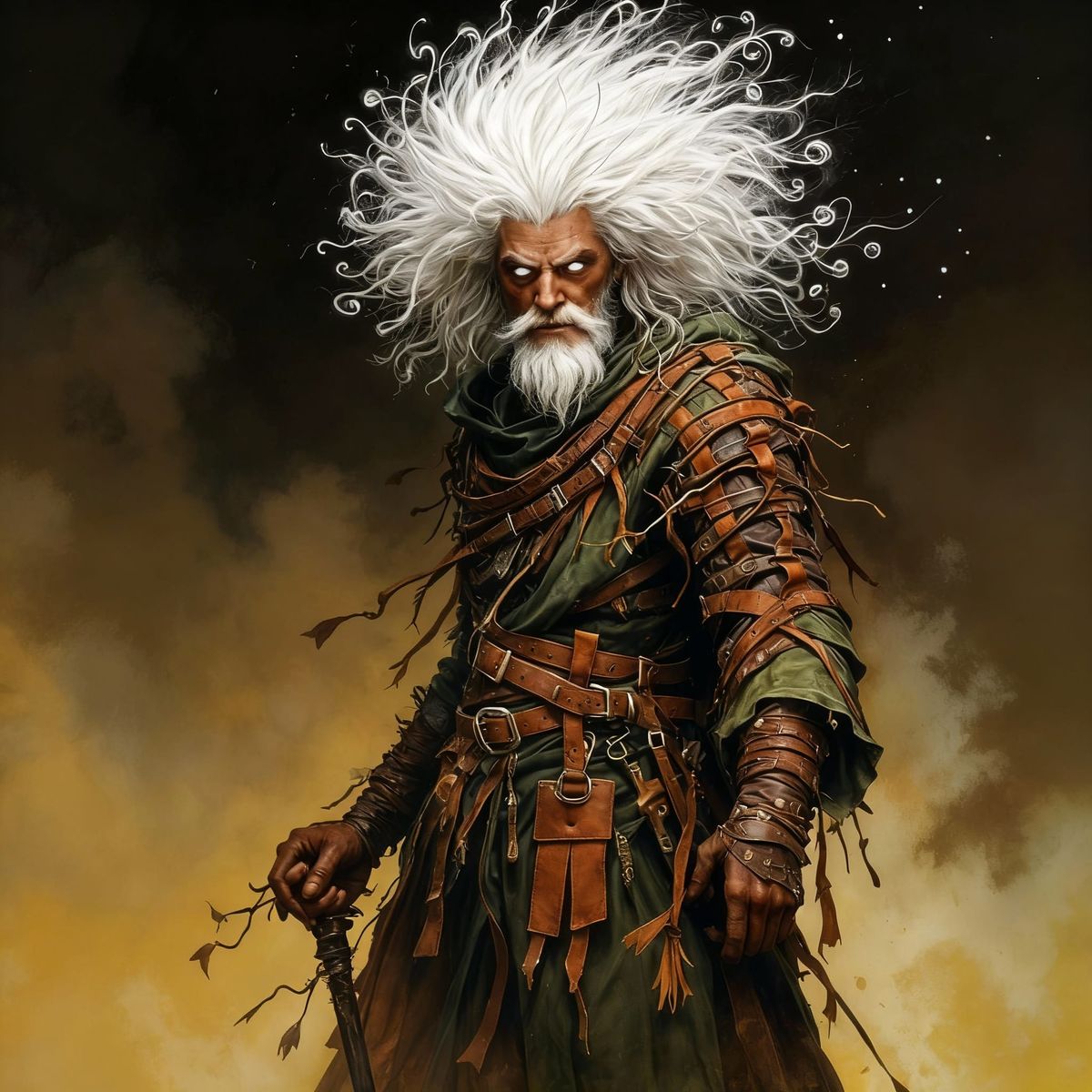 This image shows a tall, spindly cleric with white hair and pupil-less eyes, wearing leather straps and a green cloak. The ink drawing style features wet-on-wet techniques, creating an abstract modern look.