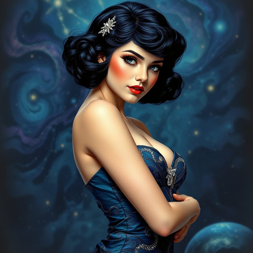 This captivating image depicts a vintage pin-up girl surrounded by a shimmering, starry gown, exuding mystical wonder and enchantment, with bold, vibrant colors and confident brushstrokes, reminiscent of a celestial tapestry
