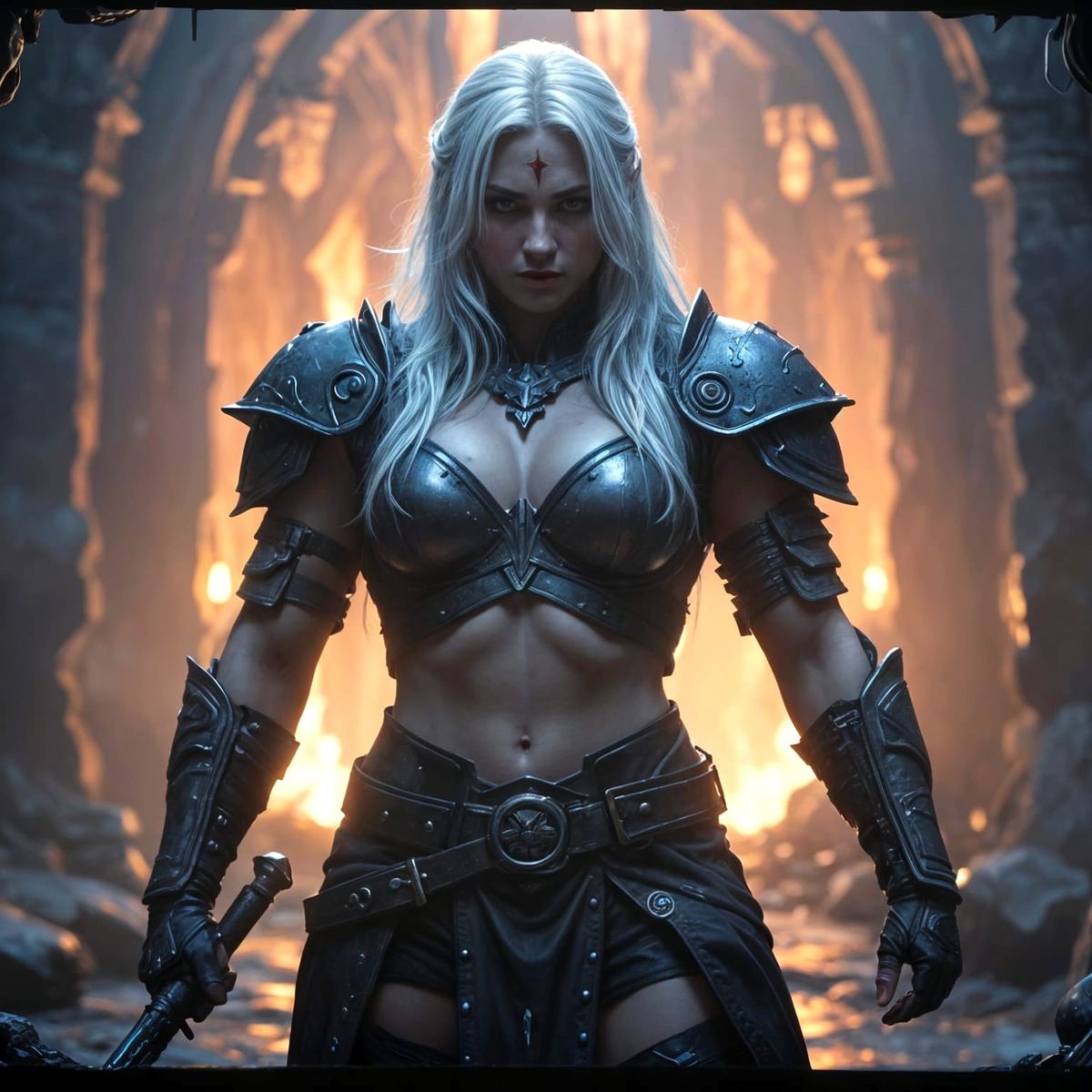 A cinematic, hyperrealistic portrait of a powerful Drow warrior woman in detailed armor. This dark fantasy art features dramatic lighting and a moody atmosphere, captured with stunning 8k resolution.