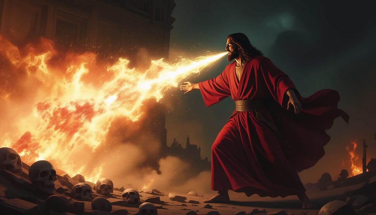 A dramatic image of Jesus Christ defeating the Antichrist. The scene features intense lighting and vivid colors reminiscent of fantastical realism, capturing a moment of divine power in an apocalyptic setting.
