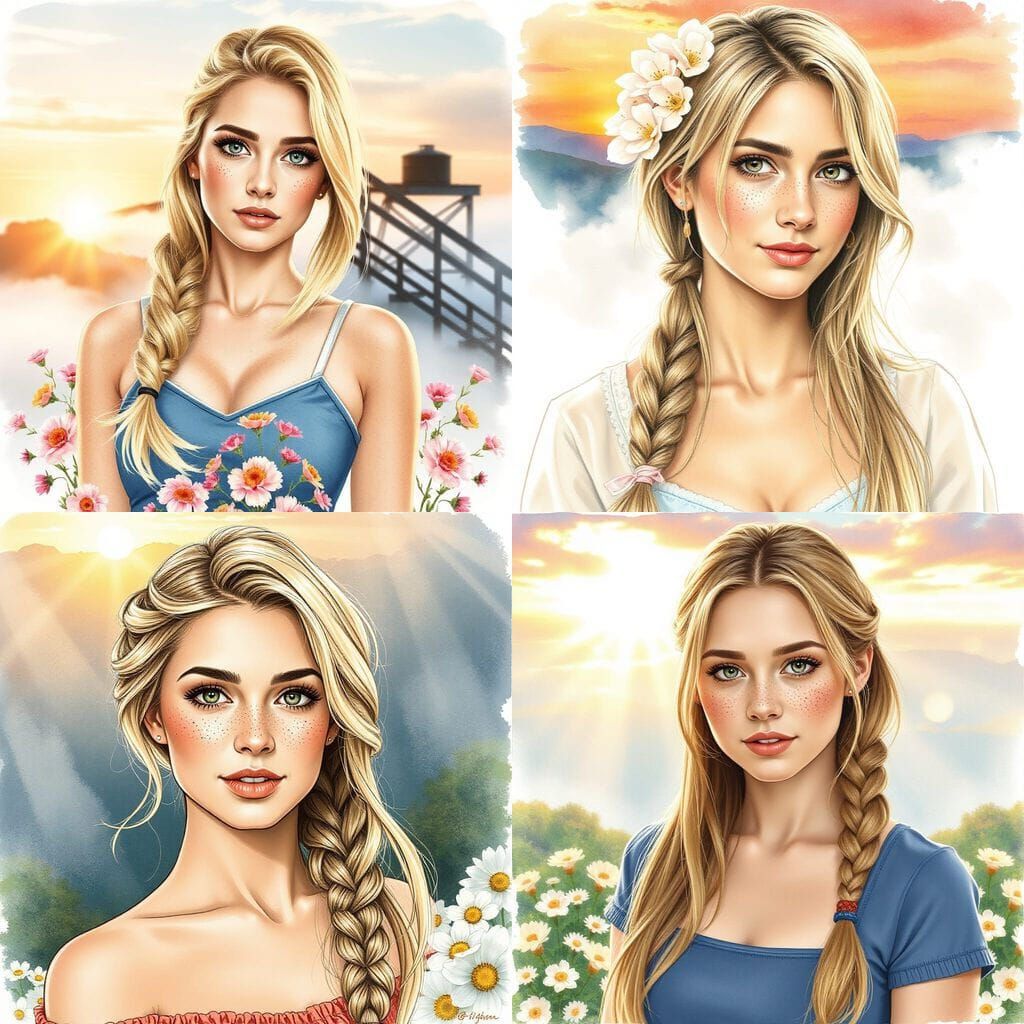 A realistic sketch of a pretty 30-year-old woman with freckles and blonde hair, depicted in a watercolor and pencil style. The scene features springtime flowers and a misty sunrise.