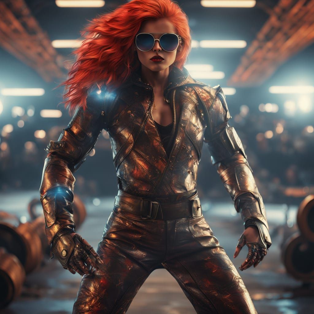 This image showcases a strong, powerful female wrestler with striking features, including red long hair, intricate tattoos, and silver mirrored sunglasses. The dramatic lighting and vivid colors create a high-energy atmosphere, with bold, bright colors and a glamorous, high-fashion aesthetic.