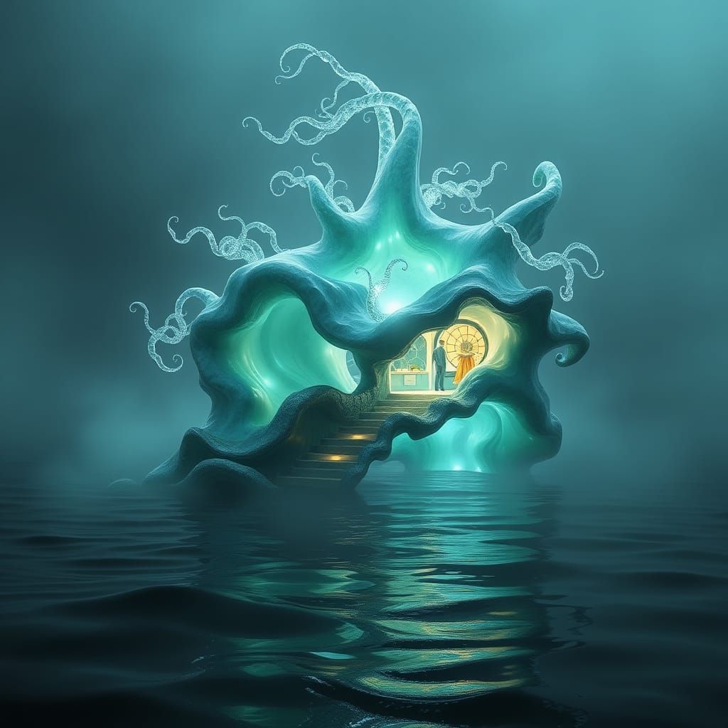 This image depicts a futuristic, eco-friendly shack rising from the misty waters of a mystical sea. Its intricate, fractal architecture shimmers with an ethereal glow, evoking a sense of wonder and enchantment.