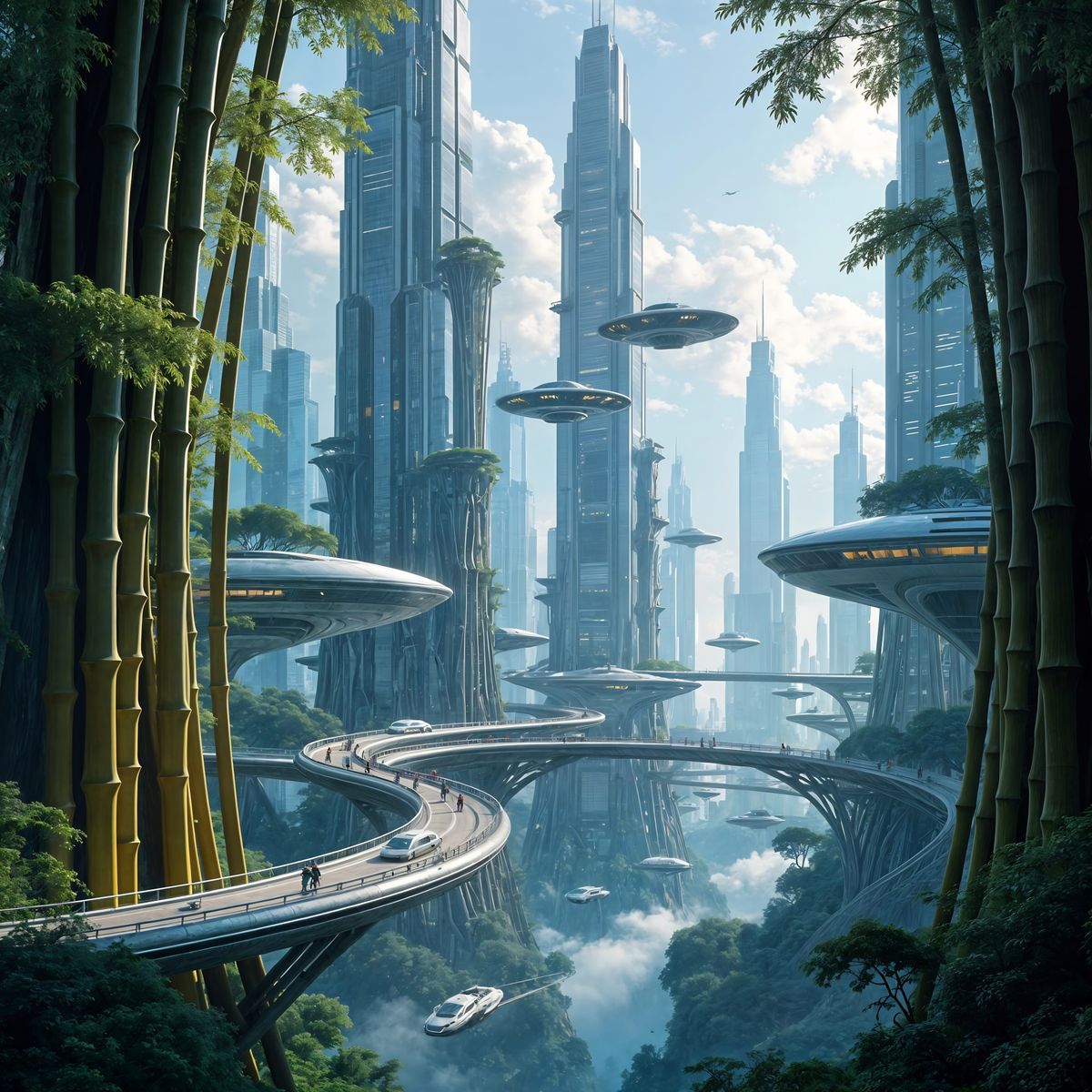 Design your own unique urban landscapes, blending futuristic architecture with natural bamboo. Free and easy AI image generation.
