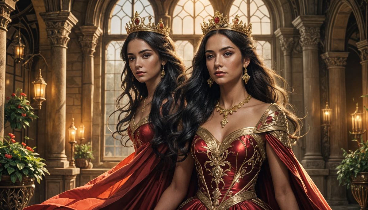 A beautiful princess with flowing black hair stands in a grand castle hall, wearing a voluminous red gown and golden crown. Soft light illuminates the elegant and magical atmosphere.