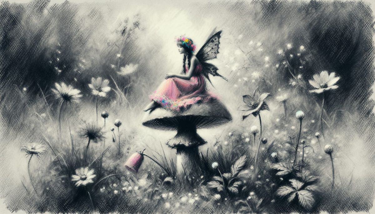 This image depicts a lone fairy in a pink summer dress sitting on a mushroom in a flowery meadow, rendered in a loose, expressionistic style reminiscent of late 19th and early 20th-century charcoal sketches.