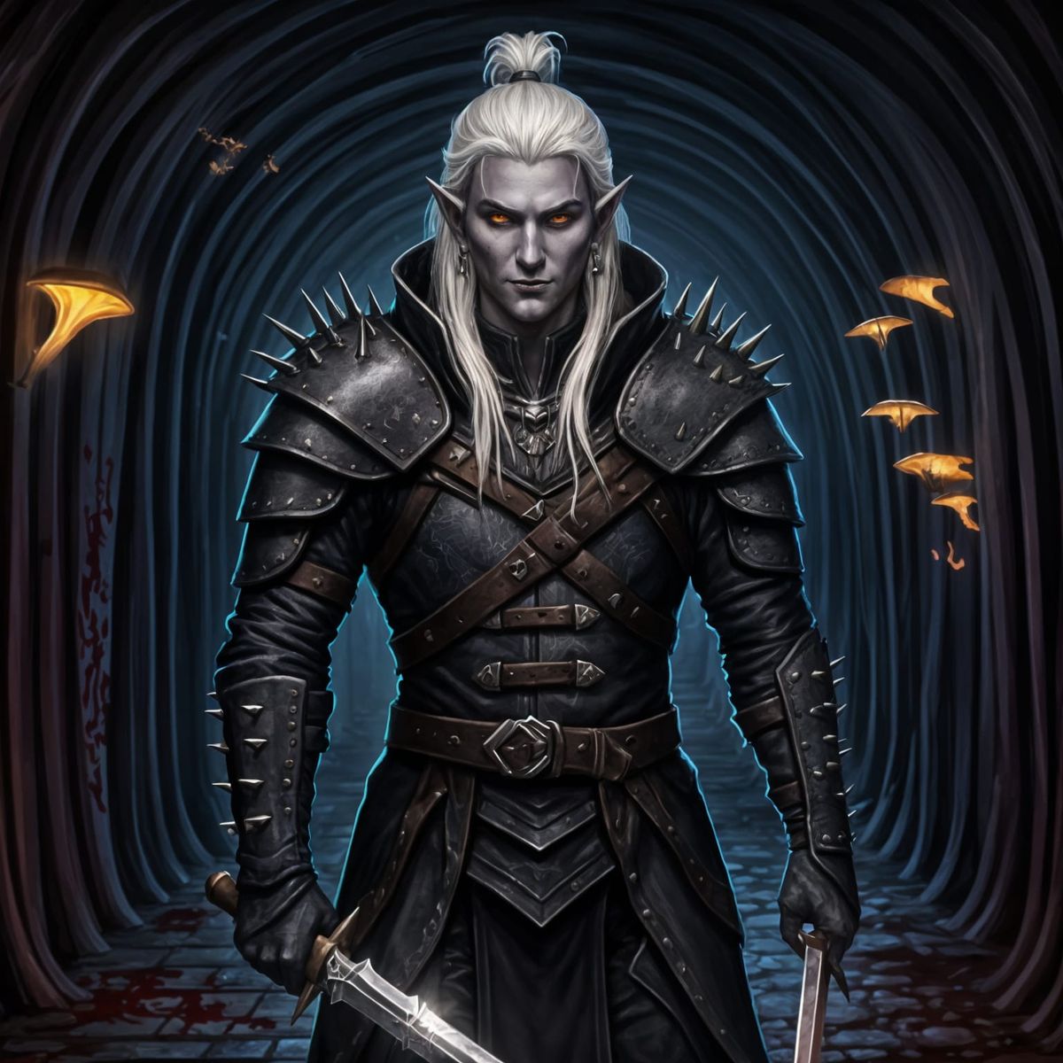 This image shows a male drow rogue in a narrow tunnel, dual daggers drawn. The rogue is wearing spiked black leather and bone earrings and the tunnel is illuminated by glowing fungi.
