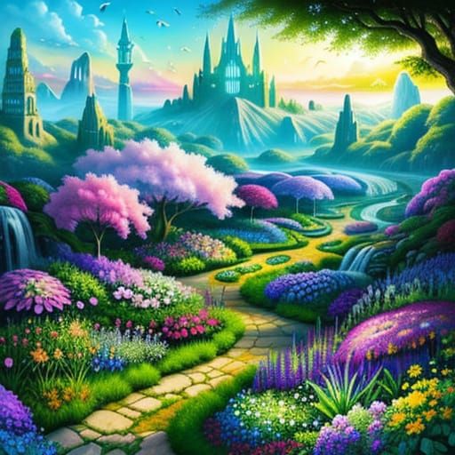 This image showcases a vibrant and fantastical landscape. The scene depicts a paradisiacal garden with colorful flora, embodying a utopian vision of natural beauty and mythological wonder.