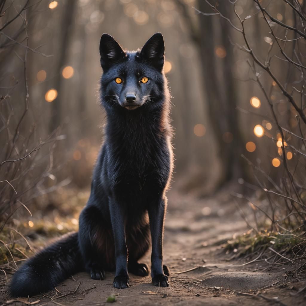 This image shows an anthropomorphic black fox with glowing eyes, captured in a professional photograph. The shot features a bokeh effect and natural lighting, creating a sharp focus.