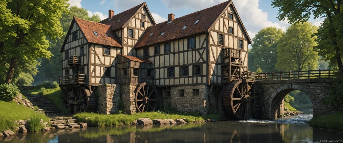 This image shows a dramatic English canal scene featuring an ancient water mill in intricate detail, with a colorful background and a sense of foreboding.