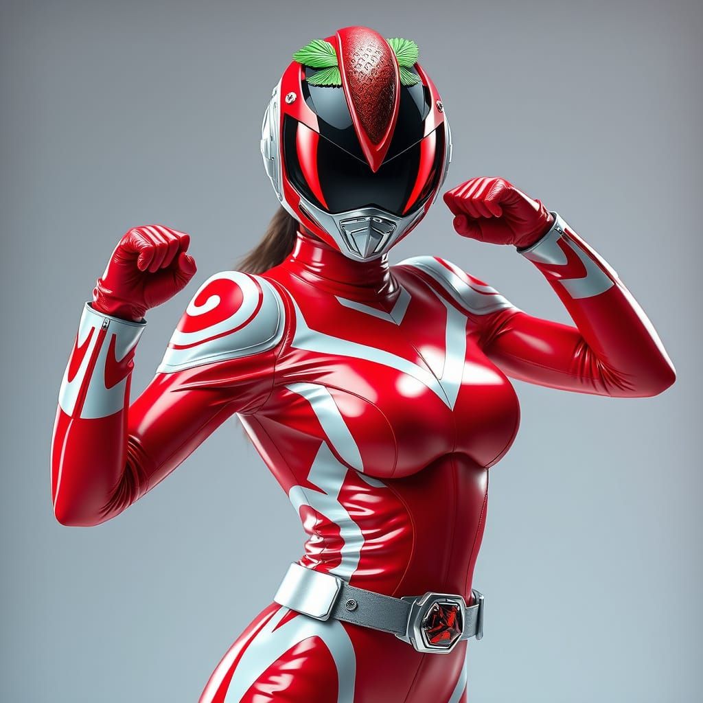 A dynamic image of a superheroine in a red armored suit, reminiscent of tokusatsu and sentai styles. The design features glossy spandex, white swirls and silver accents, in a Syd Mead inspired aesthetic.