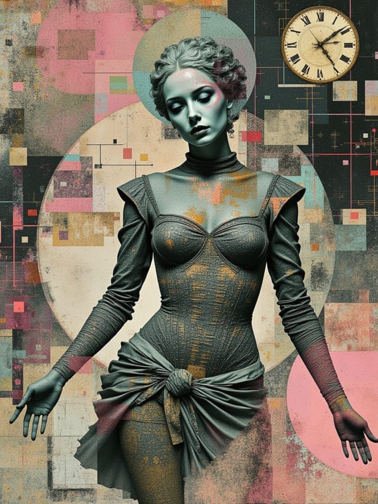 This image features a chaotic, fractured landscape with elements of comic strips, clock faces, and circuitry. It blends art deco gothic and retro-futuristic styles with a dreamlike, desolation theme.