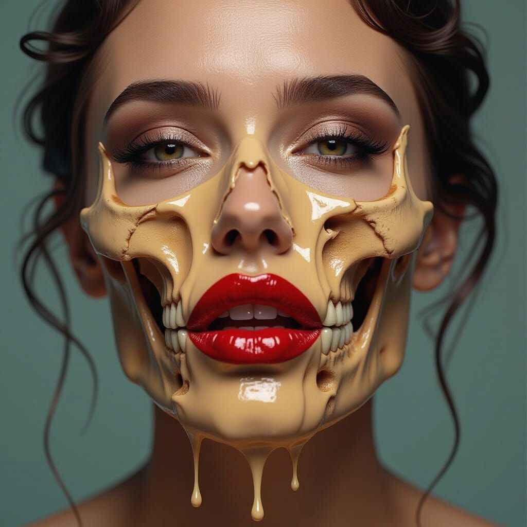 A hyper-realistic image of a woman's face made of melting oil and wax, revealing skull and muscle. Set against a detailed, evil landscape with dramatic lighting and rich colors.