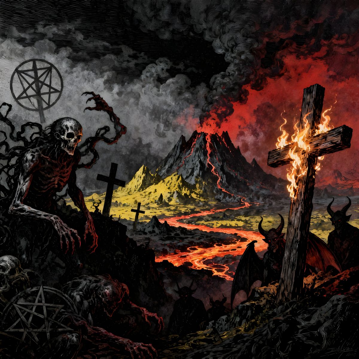 This image showcases dark, black metal album art with grotesque creatures, satanic symbols, and a burning cross in a hellish landscape. Features dramatic shading and muted colors.