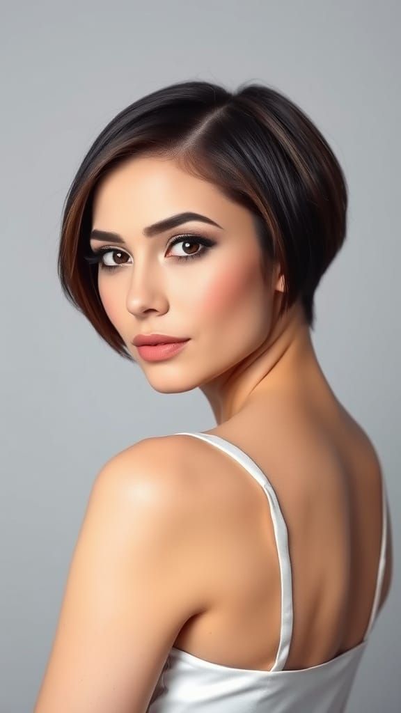 This photorealistic image shows a woman with a dark brown, sleek inverted bob hairstyle and a center parting. Studio lighting highlights her flawless makeup and satin camisole against a gray background.