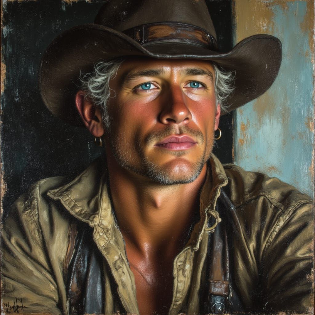 This striking oil painting features a rugged cowboy with intense icy blue eyes, rendered with heavy impasto and dramatic lighting. The art style evokes expressive brushwork and bold color contrasts.