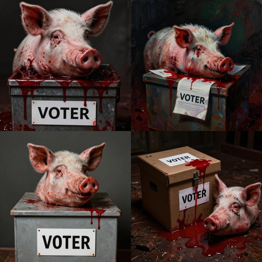 This image depicts a ballot box stained with blood and adorned with a pig's head, creating a disturbing and symbolic scene.