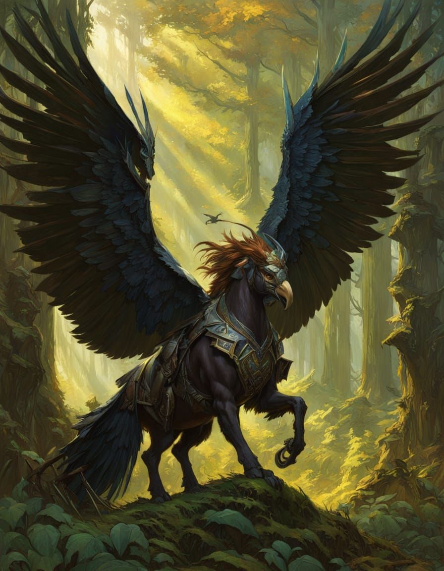 This image shows a majestic hippogryph in a serene elven forest glade, dressed in rich harness and accompanied by an elf rider. The artwork combines fantasy and elegance, evoking a sense of mystique and wonder.