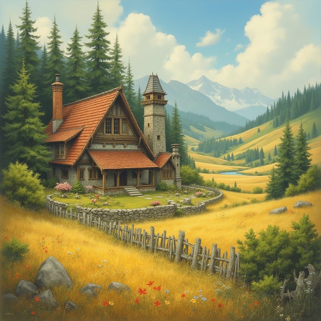 A serene village nestled among whispering pines and a flowing river, bathed in golden light and silver skies. This image captures a whimsical, intricately detailed scene.