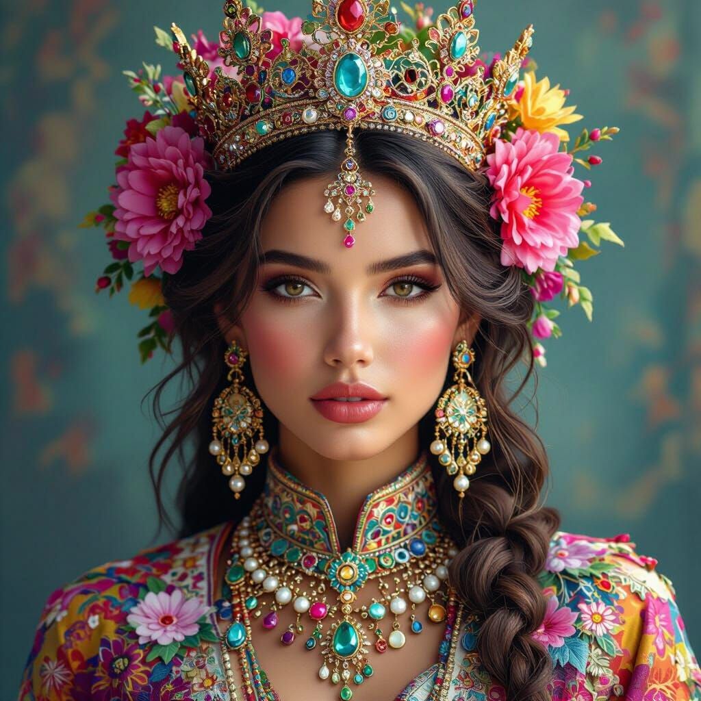 This image shows a woman adorned with a crown, jewels, flowers, and vibrant clothing. The hyperrealistic style features intricate details, textures, and lighting, creating a striking portrait.