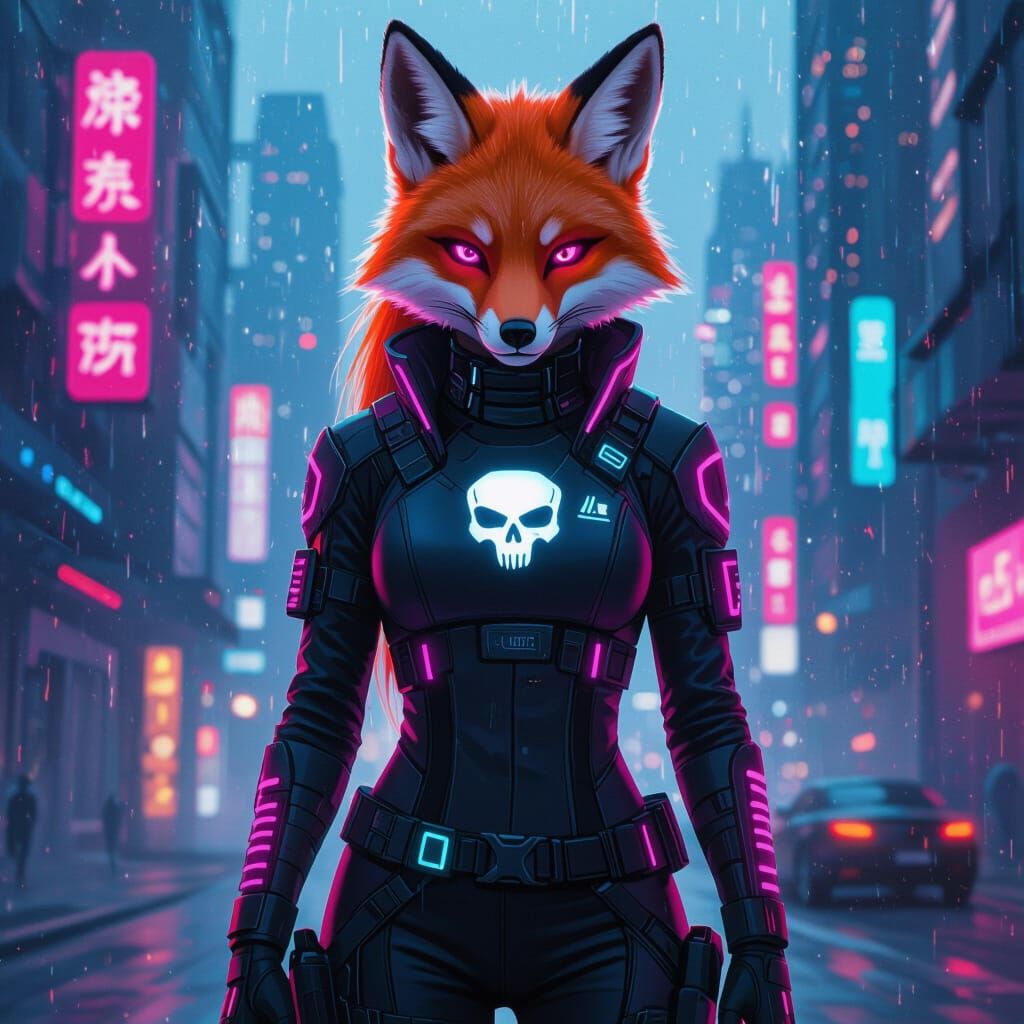 This image shows a fox-like furry character in a futuristic, neon-lit cityscape, wearing a sleek tech outfit. The design features a skull logo, rendered in a vibrant, dystopian style.