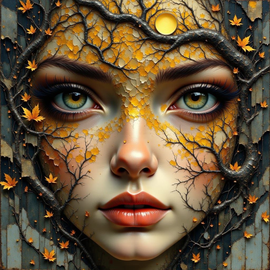 This image features a woman with intricate leaf-like hair and captivating eyes, rendered with dynamic lighting and deep colors in a detailed, photorealistic style. The artwork exhibits a brutalist aesthetic with complex filigree details.