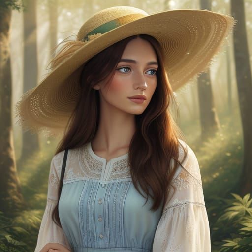 A portrait of a woman in a straw hat and embroidered dress, bathed in golden forest sunlight. This impressionistic image features soft brushstrokes, muted colors, and a dreamy, serene aesthetic.