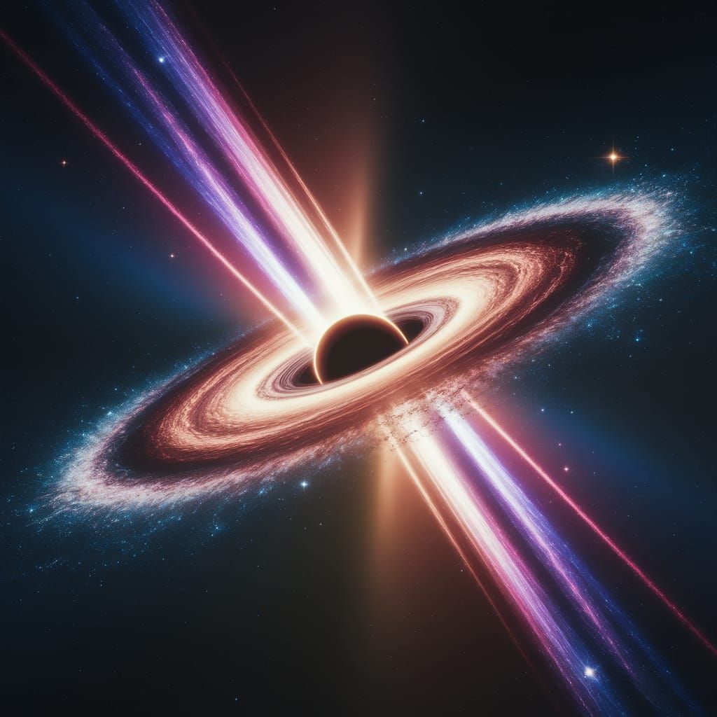 This image showcases a supermassive black hole at the center of a galaxy, emitting powerful jets. Rendered in a vibrant, mixed-media astral style reminiscent of cosmic illustrations.