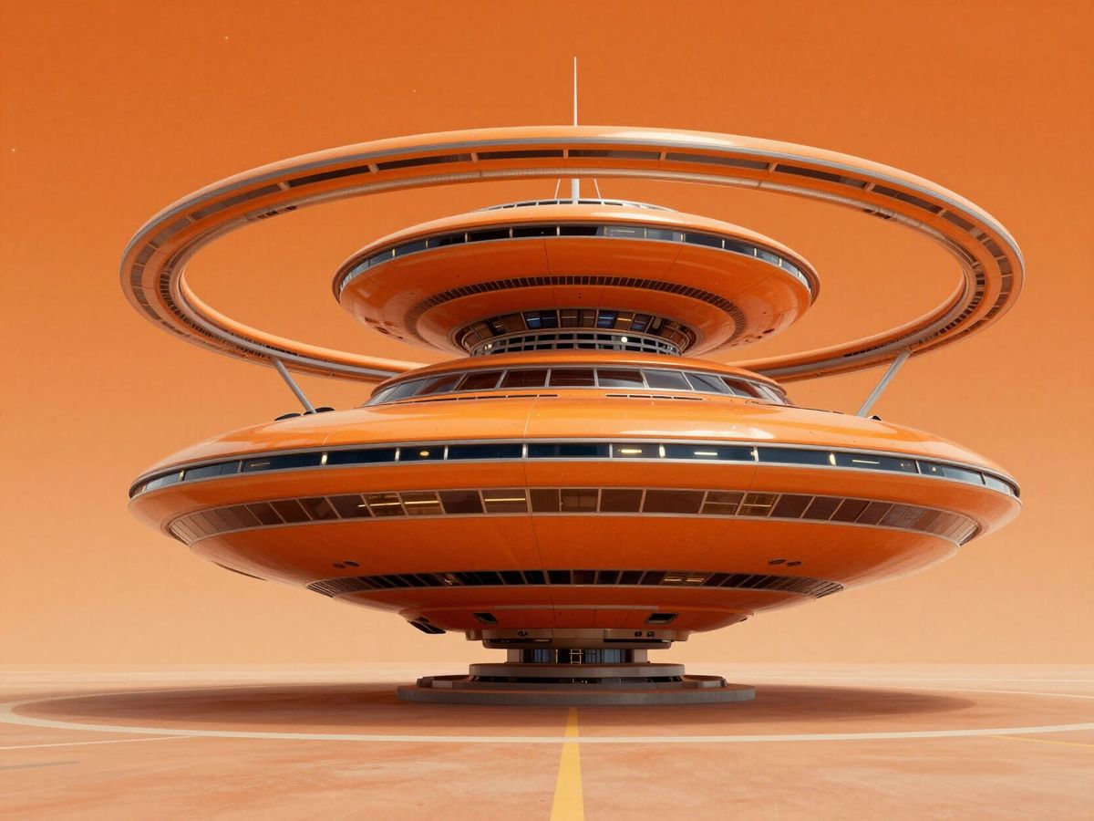 This image shows a multi-level orange spaceship featuring a large ring, set against a starry orange sky. It embodies a nostalgic 1950s-60s space age aesthetic with sleek, curved lines.
