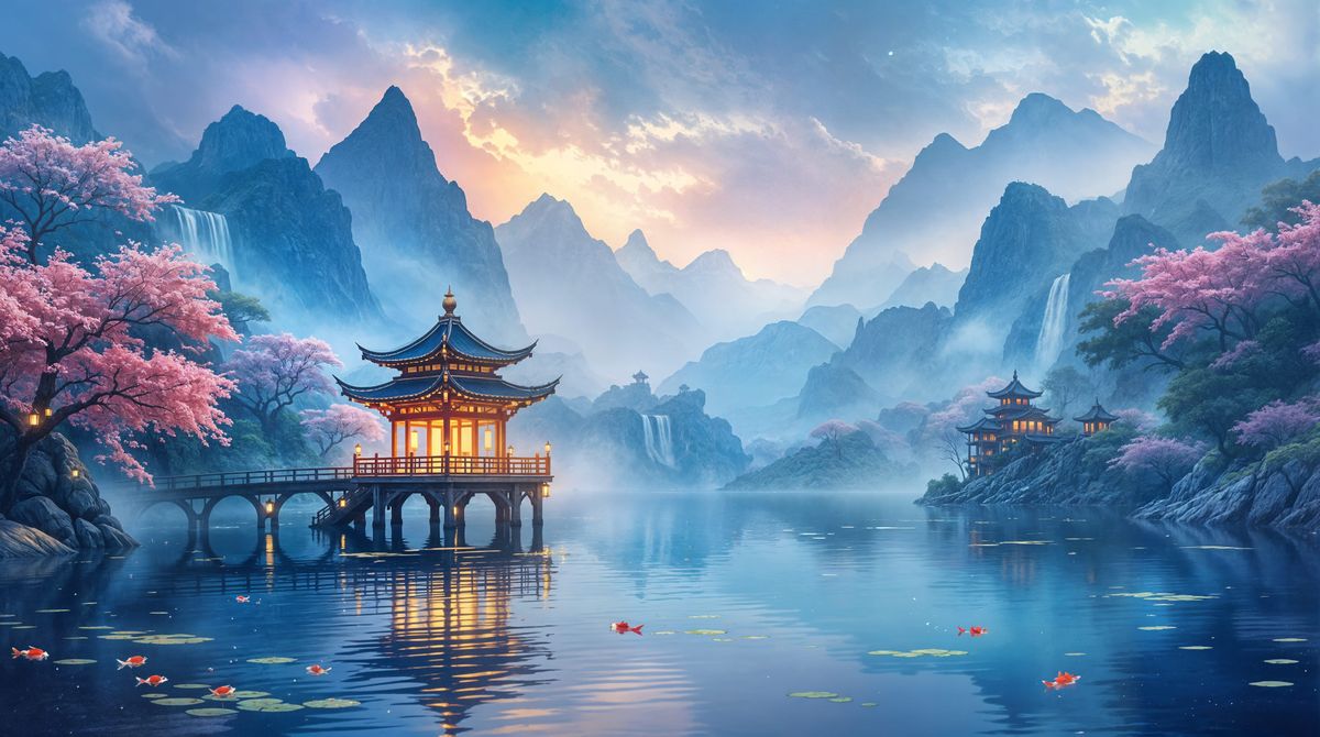 This image shows a tranquil lake in a misty valley surrounded by mist-shrouded mountain peaks and traditional Asian buildings. A picturesque gazebo, lit by glowing lanterns, sits over the water, surrounded by lush blossoming trees and vibrant aquatic life.