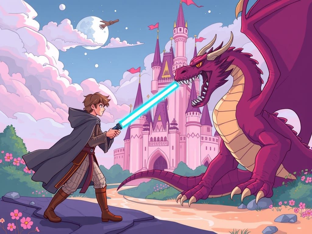 This image shows a Jedi knight battling an evil dragon in a fairytale setting. A pink, Disney-like castle sits in the background, rendered as a colorful digital illustration.