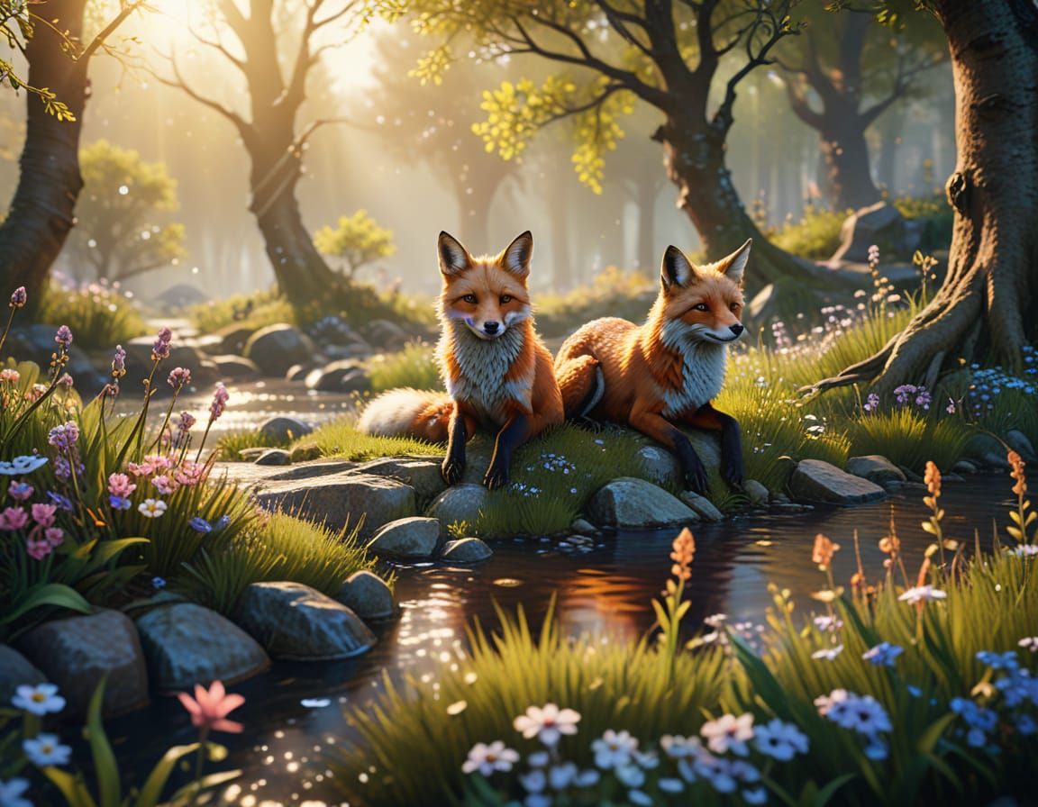 This vibrant fantasy landscape painting features two foxes in a lush spring meadow and creek, with soft brushstrokes of flowers and dappled sunlight on whimsical trees, all captured in a warm golden hour with bokeh and iridescent colors.