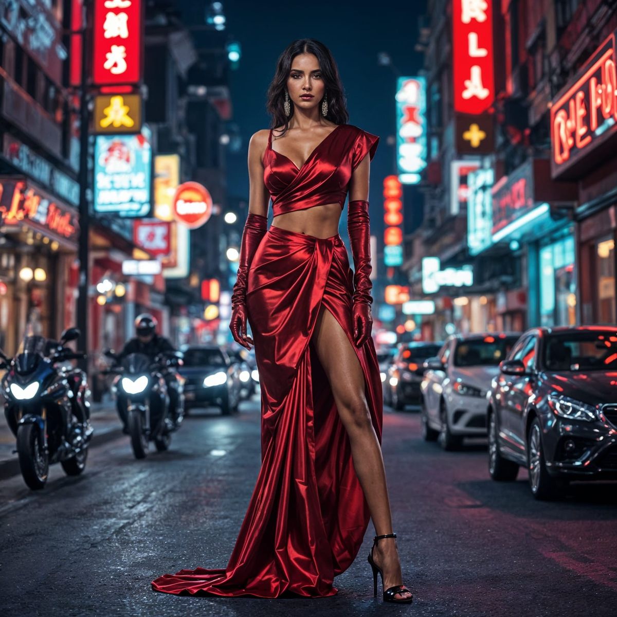 A powerful woman in a striking red silk saree and modern attire stands on a vibrant, neon-lit city street. Her look combines traditional elegance with a bold, commanding presence.