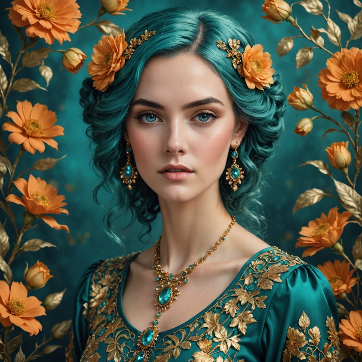 This image depicts a serene young woman with teal hair adorned with flowers, set against a floral background, with intricate details and soft textures, evoking a dreamy and elegant fantasy theme.