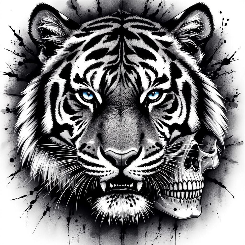 Design unique black and white tiger head and skull stencils for tattoos. Easy and free AI generation.