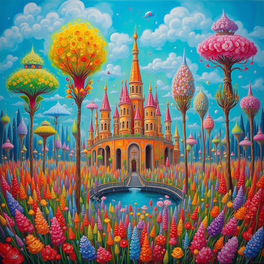 This AI-generated image depicts a surreal castle nestled within a lush, vibrant landscape, showcasing a dreamlike and colorful environment with surreal elements.
