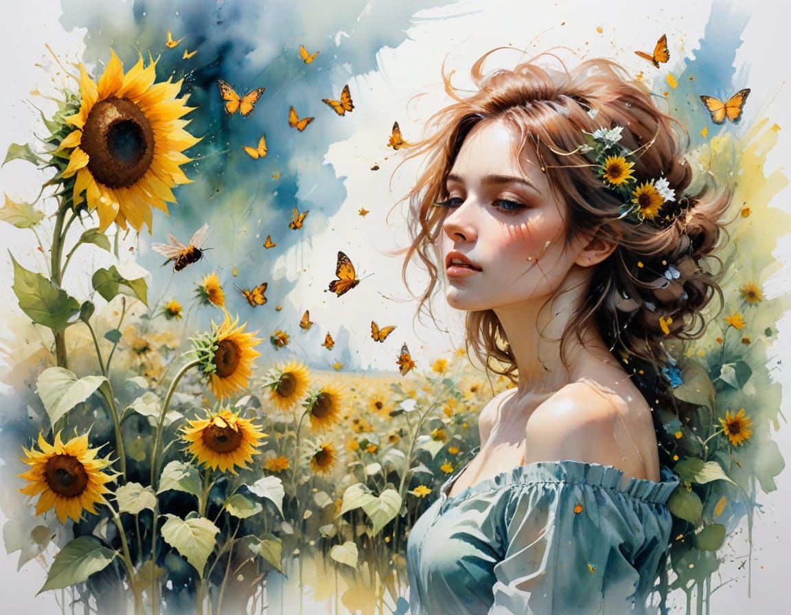 This image showcases a vibrant, impressionistic watercolor of a sunflower field. Golden petals and soft blossoms are depicted with delicate, expressive techniques, evoking a sense of harmony and gentle movement.