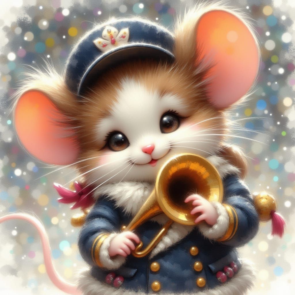 This image features an adorable mouse dressed in a college band uniform, enthusiastically playing a trumpet. A charming scene of a small musician in action.