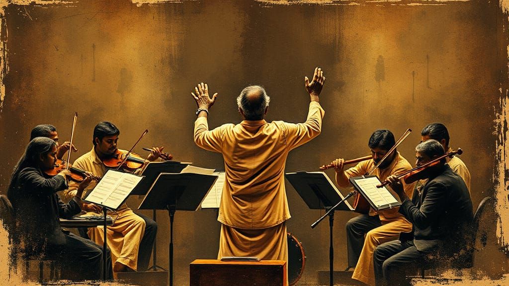 This image shows a vintage Indian music maestro conducting an orchestra in a grunge style, surrounded by musicians playing various instruments in a dark, moody atmosphere.