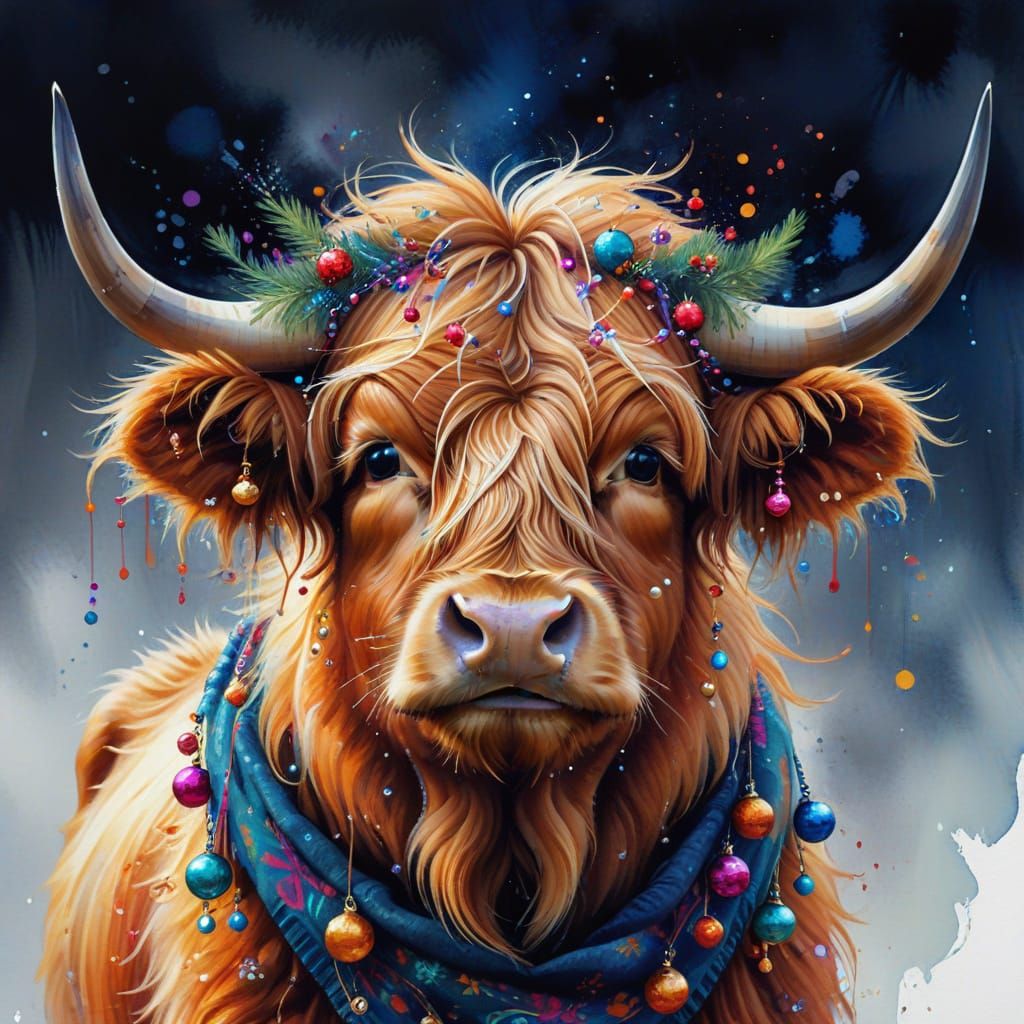 This image showcases a close-up, whimsical illustration of a highland cow adorned with baubles and a festive scarf. Rendered in vibrant watercolour washes with deep ink textures, it captures a happy, festive mood.