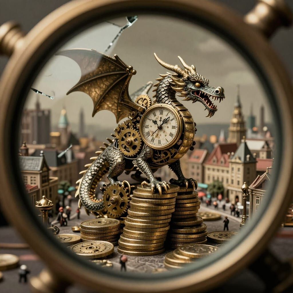 This image shows an intricate clockwork dragon on gold coins overlooking a city, presented with photorealistic detail and cinematic lighting. It features a sepia tone and shallow depth of field.