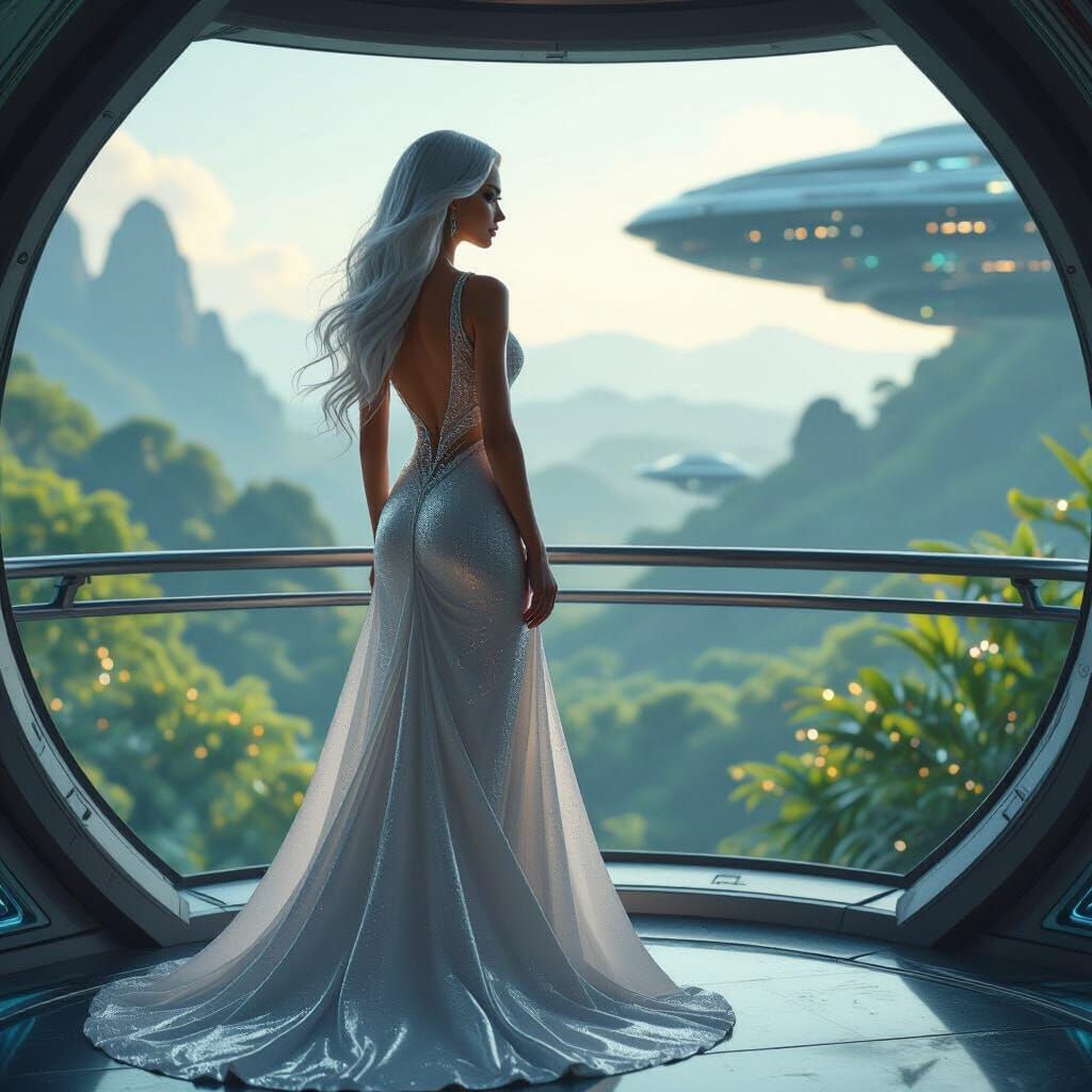 A striking picture of a futuristic woman with silver hair on a spaceship observation deck. A bioluminescent forest covers an alien world below, rendered as a cinematic film still with bokeh.