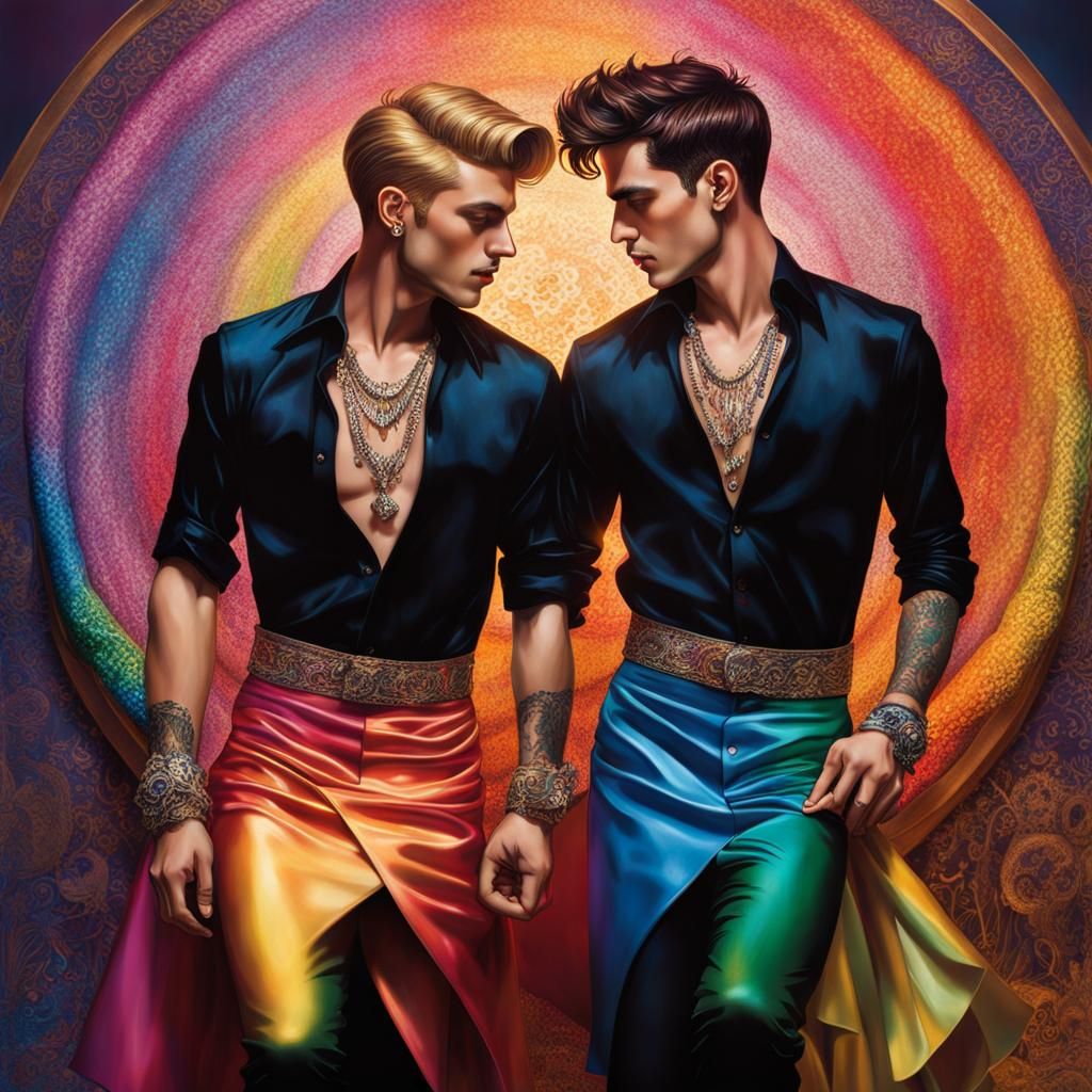 This image shows two young men dancing closely in a club. The figures are adorned with lace shirts, mini skirts, and jewelry, rendered with rainbow colors in a maximalist style.