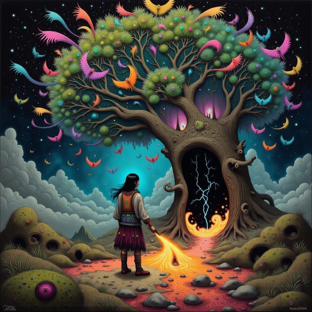This image shows a figure in traditional Cherokee dress by a sycamore tree. Thunder beings spark lightning fire within, in a style evoking Native American themes and vibrant historical scenes.