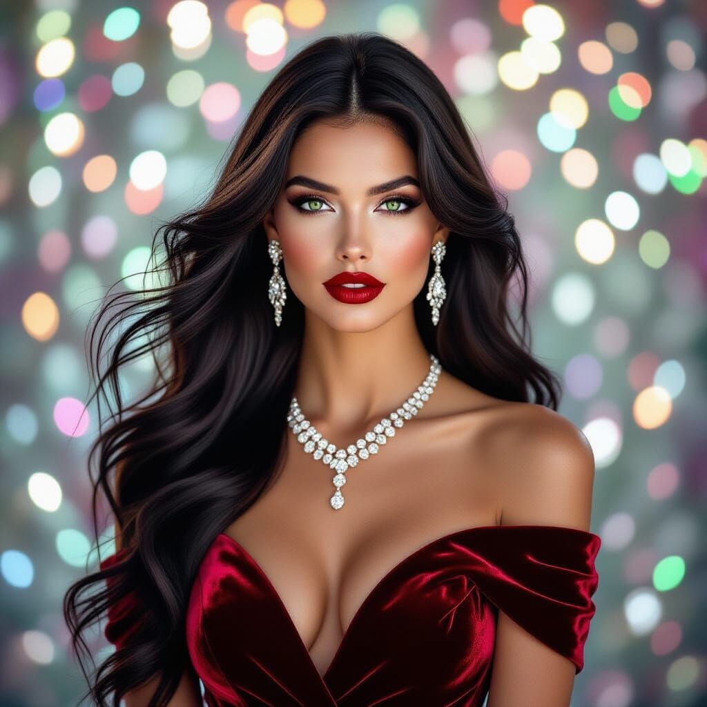 This photo-realistic image features a glamorous woman with flowing black hair and green eyes, wearing a red velvet dress and diamonds. The background bursts with iridescent jewel tones, captured with professional photography techniques.