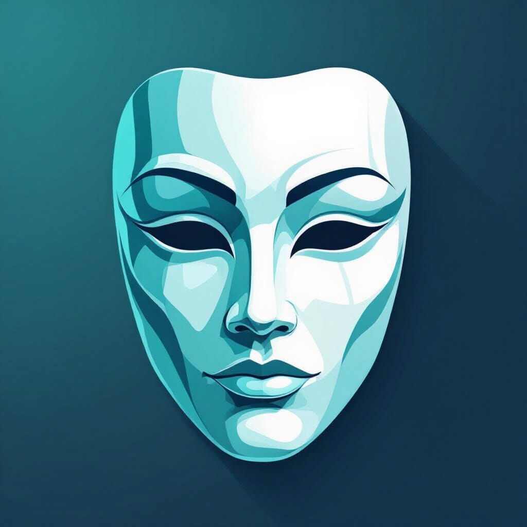 A clean vector logo for a theater, featuring a stylized mask in white and icy turquoise with sharp, angular features and a polished metallic sheen.