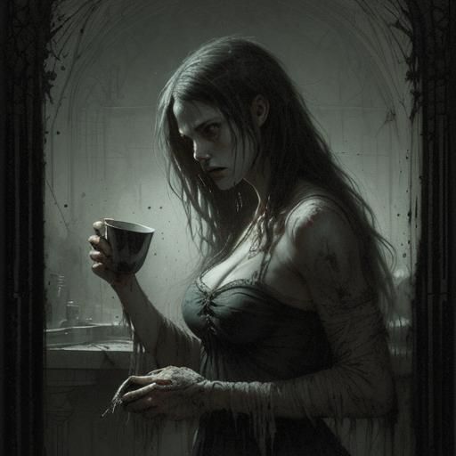 A dark and unsettling image inspired by horror themes. The artwork evokes Gustave Doré's dramatic style and Greg Rutkowski's flair, creating a haunting visual narrative.